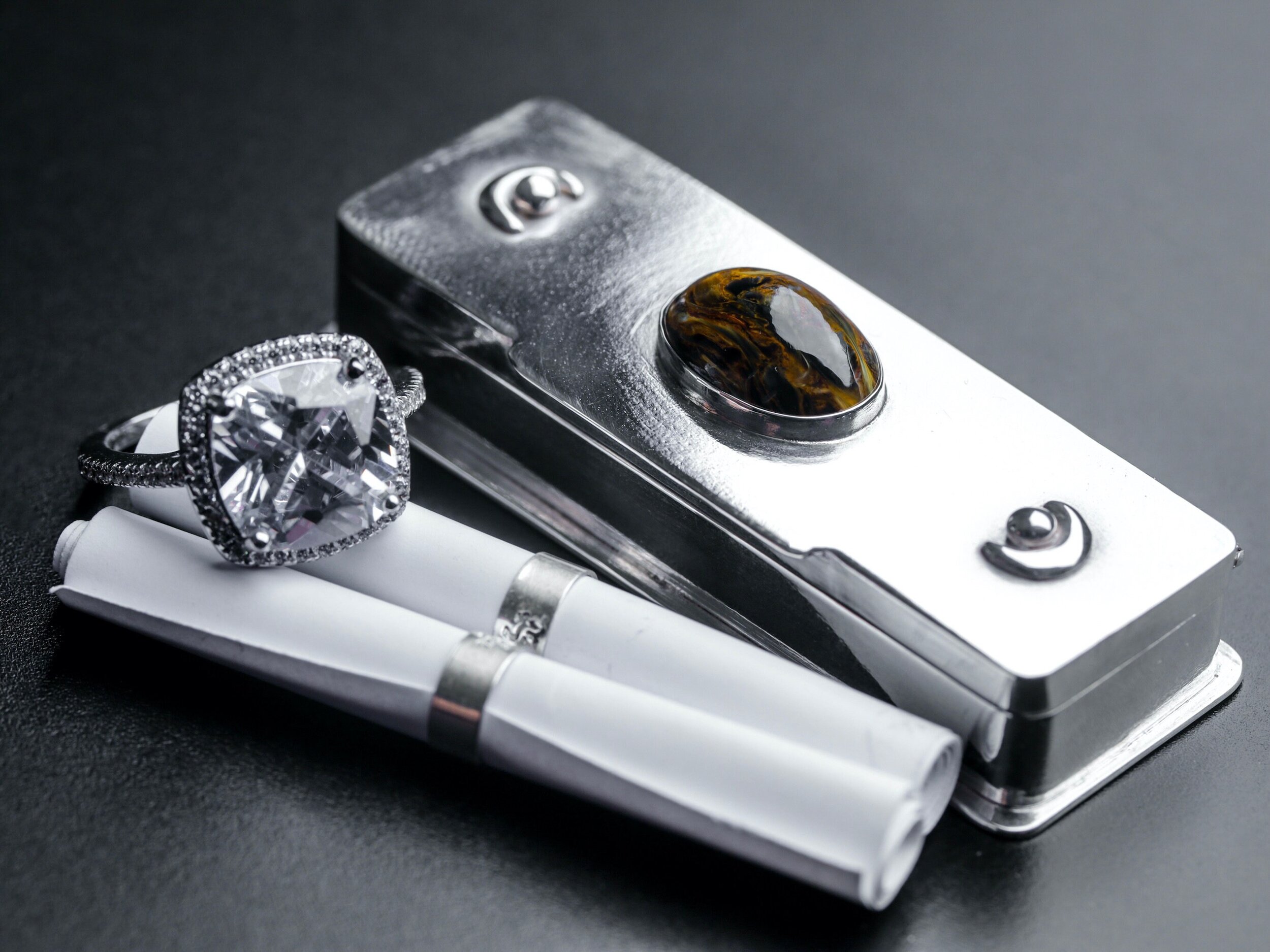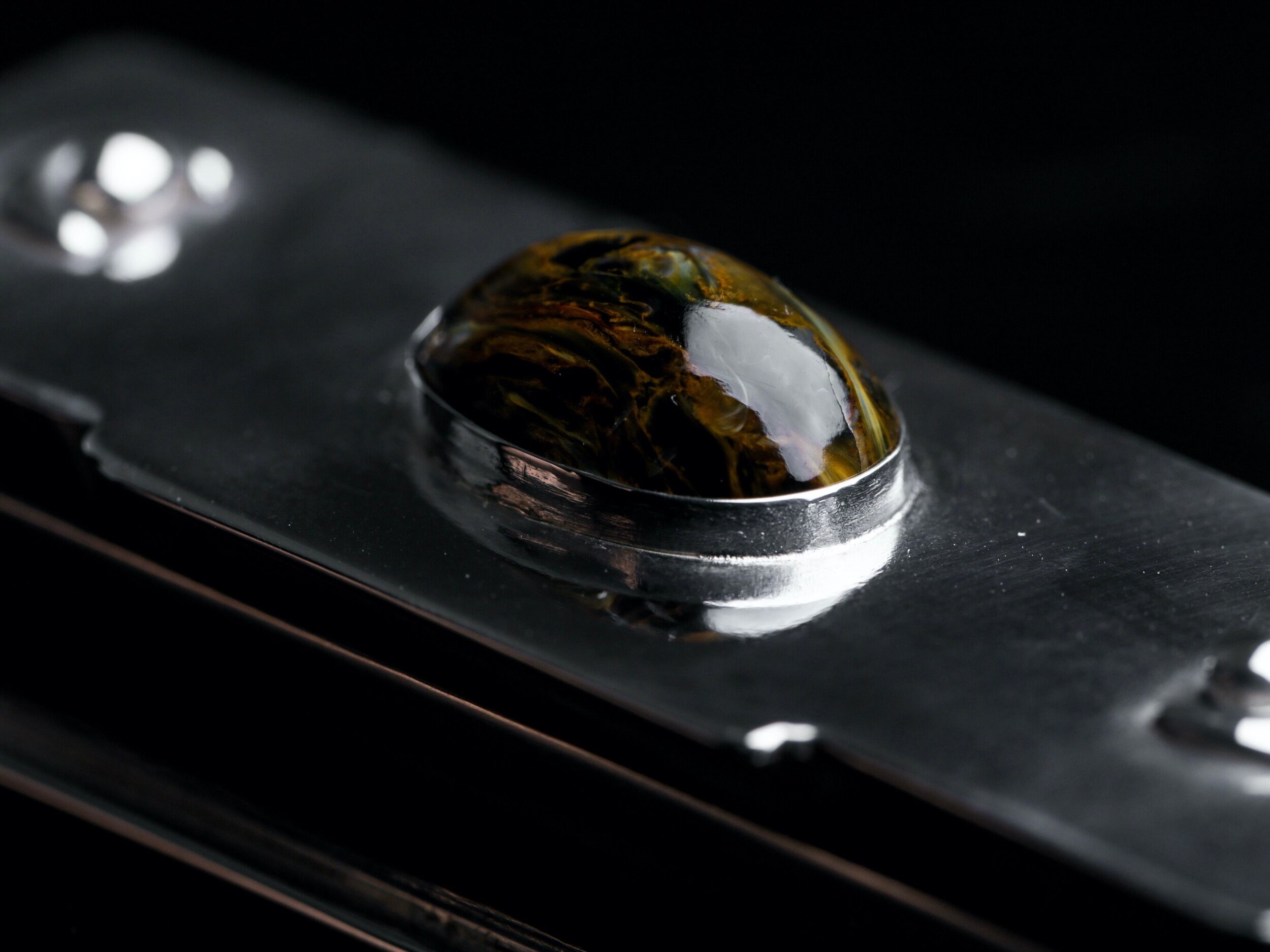 The Pietersite One features a beautiful dark and mysterious Pietersite cabochon stone, 13mm long, bezel set in the centre. Two equally mysterious abstract forms, fused to the lid surface, are in orbit.